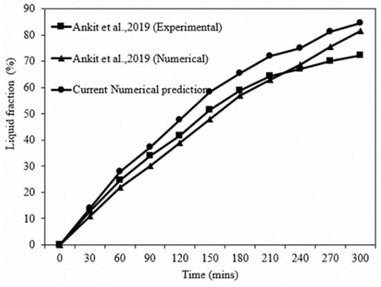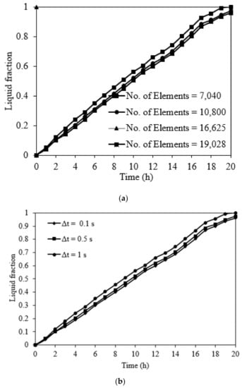 The model is verified to check the grid and time dependency of the solution before the simulation. Four different grid sizes (7040, 10,800, 16,625 and 19,028) and three different time steps: 0.1 s, 0.5 s and 1 s are examined as shown in Figure 4a,b. The model with 16,625 elements with time step sizes of 0.5 s and 1 s produced a very similar variation in liquid fraction. The results do not show significant variation as the number of elements increases to 19,028. Though there is small deviation for time step of 0.1 s, time step size has marginal effect on the results. Hence, 16,625 elements with time step 1 s have been selected for rest of the analysis.