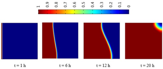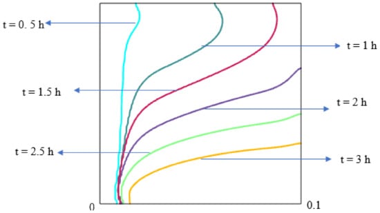 At the beginning of the melting process, heat transfer to solid PCM is predominantly by conduction. Hence, the liquid–solid interface mimics the active wall’s profile, i.e., moves parallel to the vertical left wall. Conduction heat transfer dominates till the viscous force opposes the fluid motion. Eventually, convection has more power than conduction as the molten PCM grows. High melting occurs near the top compared to bottom portion due to natural convection pattern in molten PCM as discussed before. The clockwise circulation pattern in PCM deforms the shape of the melting interface into a curved shape which can be interpreted as a push in the bottom portion of the melting interface to the left, and a pull in the top portion to the right. Hence, the melting of NaNO3 quickly reaches the right wall of the domain from the top surface. The temporal evolution of the melting interface during charging is shown in Figure 16.