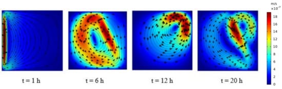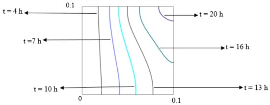 The influence of buoyancy-driven natural convection on the melting process can be visualized from Figure 7, which represents the velocity vector field with streamlines. There is a downward movement of the molten silicon due to it having a higher density than solid silicon. Hence, a counterclockwise circular motion can be observed in molten silicon. Moreover, the inertia of molten PCM forces the solid PCM to melt not only from the heated wall but also from bottom and top surface for silicon. Flow separation can be observed in molten silicon near to complete charging of the domain and only sensible heating takes place through the silicon domain. Additionally, this liquid motion provokes distortion of the flat melting front to a conical shape that results in movement of the interface in both the x and y directions. The precise 2D unsteady evolution of the mushy zone can be better manifested considering iso-fraction lines of porosity 0.5, as captured in Figure 8. The lines in the mushy zone that have porosity 0.5 are captured for the 0.1 × 0.1 m2 domain with q″ = 7500 W/m2 for a duration of 20 h. The black arrow in Figure 8 indicates the resultant direction of bulk motion of molten silicon.