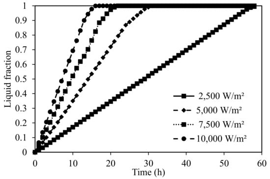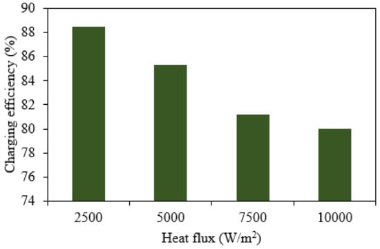The effect of the magnitude of heat fluxes on charging performance is observed by performing a parametric operation with four different uniform heat fluxes as shown in Figure 9. The four given uniform heat fluxes are considered to induce laminar flow during natural convection in molten silicon. The Rayleigh number varies from to , which satisfies the criteria of laminar flow in natural convection. With increase in flux magnitude by 300% from 2500 W/m2, the melting duration for complete charging of domain decreases by 72%. Although the melting rate increases with flux, the variation is not exactly proportional. Instead, the increase in melting rate decreases with higher heat flux on a small scale. This behavior can be explained quantitatively using the charging efficiency of the domain as shown in Figure 10. The charging efficiency of the domain can be expressed as: