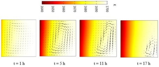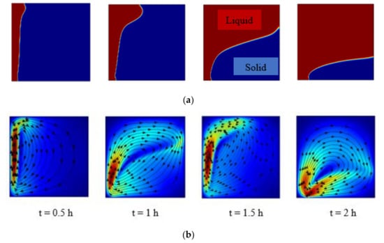 From the preceding hypothesis, the inference is the circulation pattern in molten PCM depends on the density gradient between solid and molten phases. This results counterclockwise motion of molten PCM in the silicon domain and clockwise motion in NaNO3 domain. Hence, the upper part melts faster in NaNO3 in contrast to the lower part in the silicon domain. The melting fraction distribution and circulation pattern in molten NaNO3 are captured as shown in Figure 15a,b, respectively.