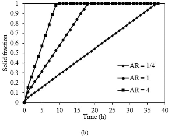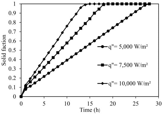 At the beginning of the discharging process, the molten silicon adjacent to the left wall cools due to direct contact with the left wall. This mechanism can be depicted as conduction heat transfer from solid PCM. This is due to the static molten PCM at the beginning, which acts as a solid domain. Eventually, a layer of solid silicon forms near the wall when temperature drops below the solidification temperature. Due to conduction dominance, the solidification front advances axially parallel to the active wall for initial duration. However, the heat transfer from molten PCM to left surface through solid PCM creates a perturbation in the molten PCM. Hence, once a layer of solid PCM forms near the left wall, the remaining molten PCM also exhibits a natural current. This leads to change in shape of solidification front from vertically straight to conical shape. The temperature of the solid layer subsequently decreases, which allows the heat transfer from molten silicon to solid silicon. As the solid region becomes thicker, the convection current reduces and conduction dominates. The flow of heat in the PCM domain is a three-stage process: (a) Conduction between the left wall and molten silicon; (b) convection at the interface between the molten silicon and the solid silicon; and (c) conduction heat transfer in the solid silicon. The effect of heat flux on discharge performance of the domain can similarly explained as shown in Figure 13. The solidification rate increases almost linearly with increase in flux. The discharge rate with q″ = 10,000 W/m2 is nearly two times the discharge rate at q″ = 5000 W/m2, i.e., the ratio of complete discharge time is 0.5.