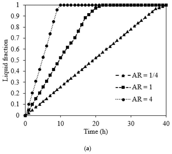The influence of the orientation of the domain on charging/discharge performance has been evaluated by considering three different aspect ratios (AR), i.e., ¼, 1 and 4 with the same surface area. All three orientations display same qualitative behavior during phase change. However, quantitatively, the thermal performance of the square geometry is found to be superior to horizontal orientation (AR = 1/4) and inferior to vertical orientation (AR = 4). In another way, the melting rate is highest for vertical orientation and smallest for horizontal orientation. This behavior can be explained using the effective heat available on the active (left) wall of all three domains. For horizontal and vertical orientation, it is 2 times less and more than square geometry as the length of domain changes for same surface area. The phase change progresses in the horizontal direction during both the charging and discharge processes. This translates into the delay in melting and solidification for horizontal orientation compared to other two, as shown in Figure 14a b.