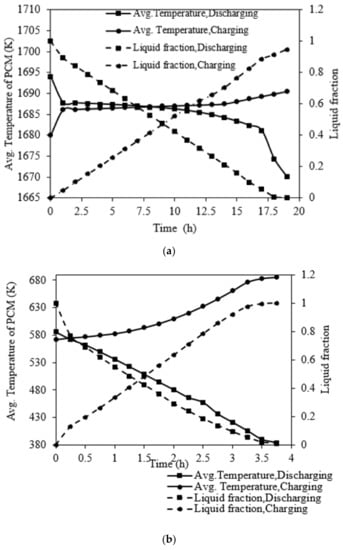 The charging and discharge performance of high-temperature LHS of AR = 1 containing Silicon and NaNO3 are compared concerning the melting/solidification duration and the energy storage/release rate. The energy storage/release rate and melting/solidification rate are the critical performance parameters, in addition to the thermal stability, for designing high-temperature LHS. As the selection of both PCMs is based on thermal stability criteria, the comparison has been performed for other performance parameters for uniform heat flux of 7500 W/m2 as shown in Figure 17a,b.
