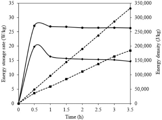 The melting rate of NaNO3 is observed to be higher than that of the silicon domain, even though silicon has very high thermal conductivity compared to NaNO3. This is due to the higher gravimetric energy density of silicon, which is nearly 10 times that of NaNO3. However, the energy storage density (J/kg) and energy storage rate (W/kg) are higher for silicon than for NaNO3. Figure 16 compares the above performance parameters to the complete charging of the NaNO3 domain. The energy storage density and rate are calculated as expressed below: