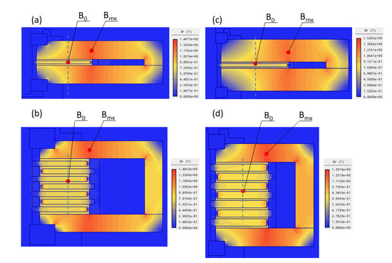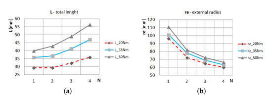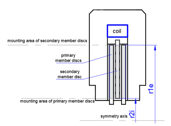 - Maximum magnetic field density is kept the same in spite of variations in the geometries of clutches. The most saturated point lies within the cover yoke at a length approximately equal to the external radius of the primary member discs [18,19] (we assumed a value of 1.2 T located at the knee of the B-H curve for magnetic steel, which is remarkably less than the saturation point 1.6 T);