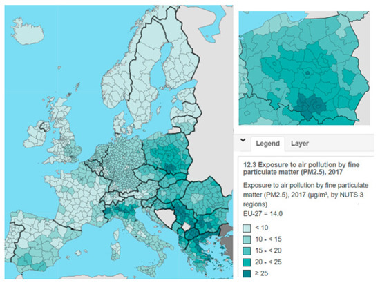 In Poland, the main sources of air pollution are emissions from fuel combustion, mainly from the energy industry and individual households, as well as emissions from transportation. Polish air protection policy is largely reactive—a drop in air pollution emitted by industry and power engineering occurred in response to the EU requirements for these sectors. However, there are no regulations for installations used in households, i.e., solid fuel furnaces, boilers, or fireplaces. Additionally, in the field of transportation, there is a lack of essential legal solutions to limit the old vehicles which are responsible for producing harmful air pollutants. The main problem related to air quality is the fact that Poland is the largest hard coal producer in the EU [17]. The most important energy carrier extracted in Poland in 2019 was hard coal with a 56.2% share. The second-largest carrier in terms of output was lignite, with a share of 15.2% [18]. These are being mined in Upper Silesia, thus making this a large area with enormous concentration of industry and poor long-term air quality [19]. As an example, Figure 1 presents PM2.5 pollution in Poland compared to other EU countries.