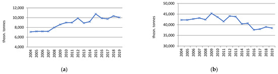Due to many years of neglect, Poland faces now serious challenges of air pollution—one of the most serious in the entire European Union. For several years now, national and international programmes have been available on the market to provide financial support for the replacement of coal-fired boilers with modern low-emission boilers, which promises to reduce emissions from this source in the coming years. For years, coal consumption in this sector has been on an upward trend (Figure 2a), while consumption in power plants and CHP plants has gone down (Figure 2b).