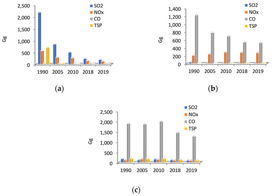 (a) energy industry; (b) transportation; (c) other sectors; where: TSP—total suspended particles.