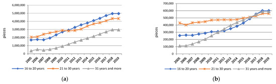 Number of cars over 15 years old (a) passenger cars; (b) lorries [44].