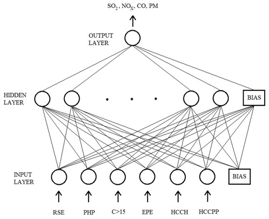 An analysis of all developed models showed that the network models MLP 6-7-1 (Network with 6 neurons in the input layer, 7 neurons in the hidden layer and with 1 output layer), MLP 6-4-1, MLP 6-5-1, MLP 6-5-1 are the most effective in the study of air pollutant emissions. Table 2 presents parameters describing the results for the obtained MLP network structures. The network quality parameters obtained (training, testing, validation) are high—85–90%—or very high 96–99%.