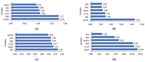 In the case of CO emissions, the sensitivity analysis showed a very similar significance of most of the variables EPE, HCCH, C > 15, RSE, PHP (Figure 6c). Therefore, even though the EPE variable is in the first position, the impact on the forecast result of the other variables is highly significant. It should be emphasized that the scenarios for the development of other variables are upward. A significant CO emission source in Poland is the burning of coal in households and the fact that it is increasing every year. The assumed increase in this variable as well as the increase in emissions from transportation, as another important source of emissions, does not make the predictions positive and shows an upward trend (Table 4).