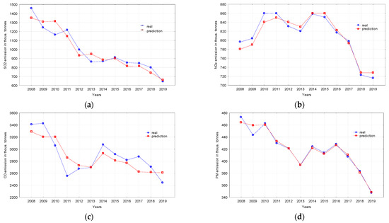 Observed and modelled by MLP value of emission: (a) SO2; (b) NOx; (c) CO; (d) PM.