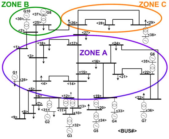 Figure 2 shows the diagram of the IEEE 39-bus power system test case with three zones. In this system, different thresholds are found depending on the area where the disturbance occurs, and it is possible to determine in which plant to carry out the emergency control.
