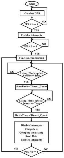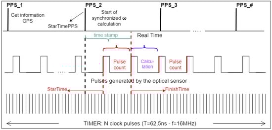 Given the information sent by the GPS (date, hour GTM, length, latitude, PPS, and others), it takes a few hundred milliseconds, and the data is not received every time a PPS is generated. Therefore, this information is received in the first PPS pulse, and the date and time are filtered. Once the data are obtained, time is broken down into respective parts (hours, minutes, and seconds). Moreover, each time a PPS is received, these data are synchronized, increasing the seconds corresponding to the hour. However, a timestamp is necessary for the angular velocity variable, calculated as shown in Equation (11). From PPS_2 (Figure 5), which generates an interruption and activates the angular velocity calculation, the time is synchronized, and the elapsed time is taken by the TIMER1 assigning its value to the variable . Then, following the attainment the respective pulses of the optical sensor (which are used to calculate the angular velocity), a time value is assigned to the variable .