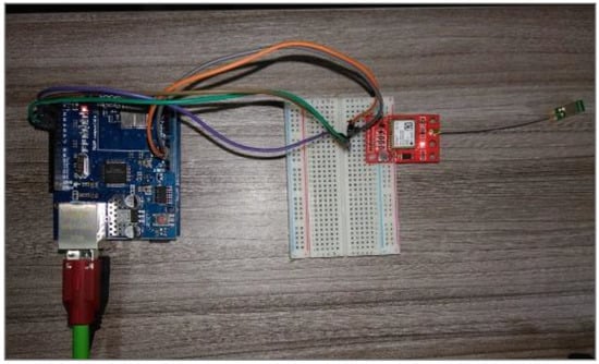 For the synchronization of the speed measurement, the PPS generated by the global navigation satellite system (GNSS) is used. This pulse is obtained through a GPS module [31], which, when picked up by the CPU, starts the algorithm for the calculation of the variable of interest with its respective time stamp and sends data using the UDP protocol. This is performed using the W5100 Ethernet Shield designed for the CPU ArduinoUno. The implementation of the measurement system is illustrated in Figure 3.