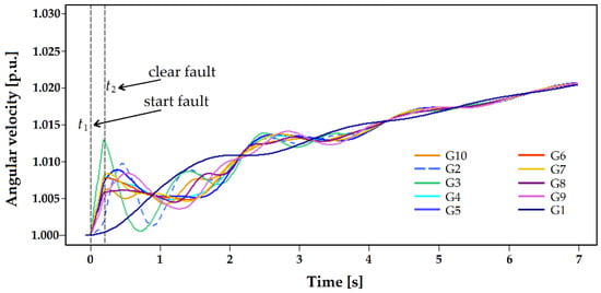 In this case, a three-phase fault in line 26–28 (zone C) is carried out at . Then, the fault is cleared at 100 ms, tripping the line simultaneously. Thus, Figure 14 shows that the angular velocity of each machine rotor increases after the first oscillation. After three seconds, the oscillation is reduced and the angular velocity continues to increase, looking for a higher operating point, whilst maintaining stability at any instant of the post-fault event.