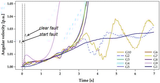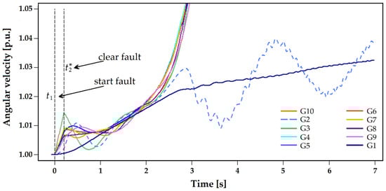 In turn, Figure 10 shows that when the fault is cleared at , taking a longer time to do so than the time , the system becomes unstable after the first oscillation of the machines. In this case, the acceleration is slight and a group of generators causes the system to rapidly become unstable. For both this case and the previous one, the solution is to rapidly determine the moment when the faults must be cleared to avoid system instability.