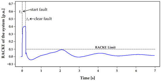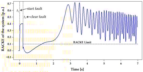 Figure 12 shows the behavior of the RACKE_SIS for an unstable case of the three-phase fault in line 13–14, when the clearing time is = 200 ms. Note that the RACKE_SIS, during the transient state operation, presents a similar value to the critical stable case presented in Figure 11. However, after the event and the first response, the machines begin to absorb energy rapidly until they collapse. When the curve reaches the limit (RACKE > ), the generators continue to absorb kinetic energy, making them move faster, thus further increasing their kinetic energy. Therefore, a control action must be carried out when this limit is exceeded to dissipate the energy stored by the electrical machines.