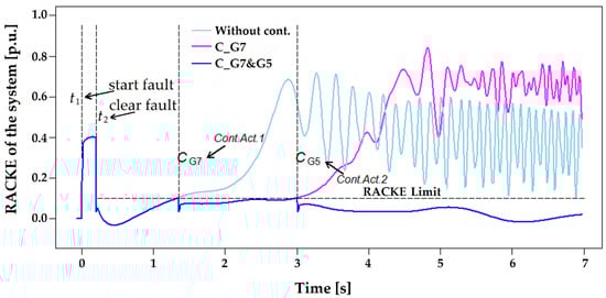 Figure 13 shows the behavior of the RACKE_SIS when the three-phase fault is presented on line 13–14 with a clearing time = 200 ms (unstable case), but considers two control actions, such as, first, reducing the power generation only in G7 and, second, reducing the power generation in G7 and G5, subsequently applying the SPS. The first curve, the light blue line, corresponds to the response of the system without control, showing the unstable system, as previously presented, and requires a reduction of the supplied power to achieve stability. Then, a second curve, the fuchsia line, is the result of considering a control action on G7 (−33% power); however, this action is not enough to solve the problem and the machines continue to absorb kinetic energy, and the limit is exceeded again at 3 s. Finally, a third curve, the dark blue line, is the result of considering a second control action on the generator with the highest AR (G5 with −33% power at 3 s); in this case, the system maintains synchronism (RACKE < ) and the kinetic energy absorbed by each machine is delivered to the system. Therefore, with this last control action, the stability of the system is guaranteed.