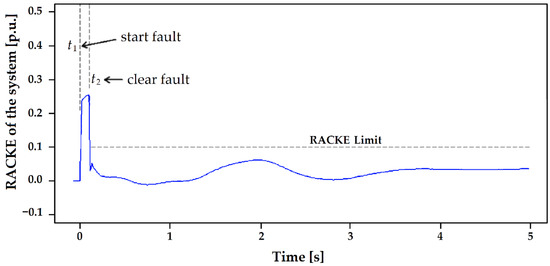 Likewise, the kinetic energy change criterion is computed in the three-phase fault in line 26–28, which is shown in Figure 15. When the fault occurs at 0, the RACKE starts increasing and reaches the highest value of the event. Then, when the fault is cleared at 100 ms and the line is tripped, the RACKE decreases to the lowest limit values and starts oscillating. The RACKE maintains oscillation during the first 4 s and then it shows stabilization. The result shows that the system maintains stability during the studied period. Effectively, it is noted how the threshold is not reached at any instant of the post-fault event.