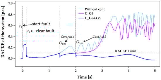 Figure 17 shows the behavior of the RACKE when a three-phase fault in line 26–28 (zone C) is simulated and the fault is cleared at = 130 ms (unstable case), but considers two control actions with the use of the SPS described in Section 2, such as, first, reducing the power generation only in G9 and, second, reducing the power generation in G5. The first curve, the light blue line, corresponds to the response of the system without control, showing that the system is unstable and requires a reduction of the supplied power to achieve stability. The result shows that the RACKE exceeds the limit (1.4 s) and control actions are required to maintain stability.