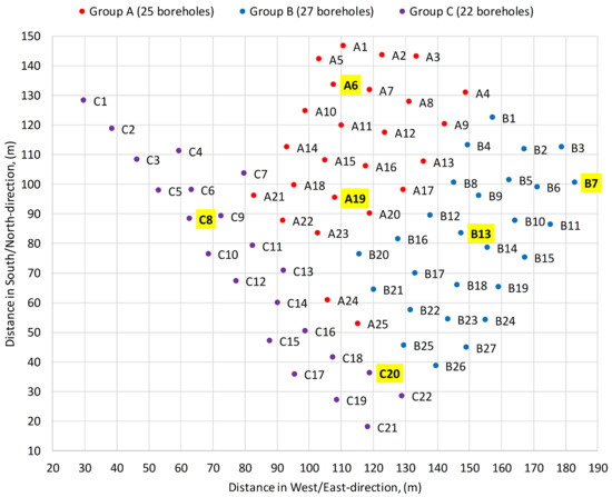 This research is based on the data gathered from Aalto New Campus Complex (ANCC) and its GSHP-GHE energy system, which has been introduced in detail in previous research [21] and analyzed in the present case study. Its 800 kW GSHP is connected to an irregular BTES field composed of 74 40mm-single-U groundwater-filled boreholes. All boreholes are connected in parallel, and their location/nomenclature is depicted in Figure 1 (boreholes highlighted in yellow belong to the DTS monitoring system). All 74 boreholes are drilled in hard rock (granite) with negligible fracturing; therefore, groundwater advection can also be neglected (heat is transferred to the ground dominantly by conduction). The most relevant properties of the ANCC borehole heat exchanger (BHE) are summarized in Table 1.