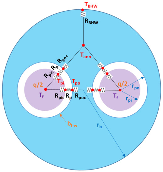 The procedure for estimating the effective thermal resistance of groundwater-filled boreholes is based on the recently developed correlations by Spitler et al. [7,25]. The methodology is summarized in the following subchapters and the procedure is developed according to the star-delta scheme depicted in Figure 3.