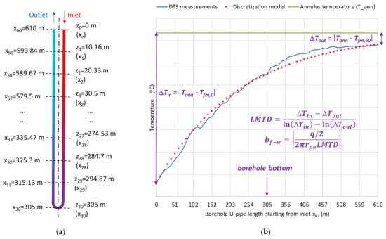 DTS measurement setup of borehole A19: Vertical DTS data layout with 61 datapoints along the borehole U-pipe path (a) and discretization along the U-pipe length using LMTD and fluid-to-water heat transfer coefficient bf–w (b).