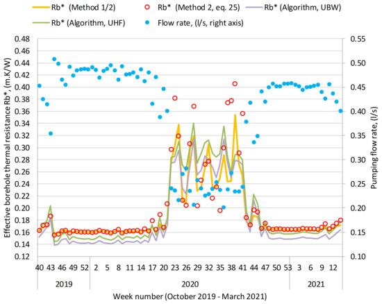 The average internal resistance Ra obtained with method 2 (0.26 m·K/W) is slightly higher than the outcome of the algorithm with UBW (0.19 m·K/W), values in line with 0.32 m·K/W calculated with the first-order multipole method [4,33] for grouted borehole (assuming grout thermal conductivity kg = 1.2 W/mK). The same is valid when comparing the average local resistance Rb: 0.15, 0.12, and 0.09 m·K/W respectively with method 2, algorithm with UBW and the first-order multipole [4,33]; however it is compensated by the parameter η (1.38 vs. 1.58), and finally all outcomes for Rb* are very similar over the whole 18-month-long period (Table 3).