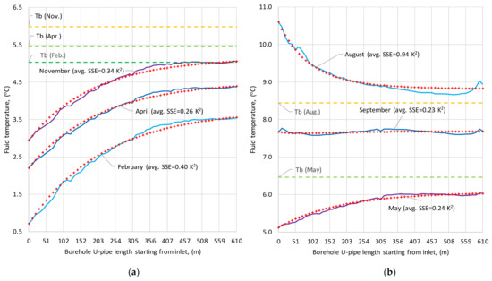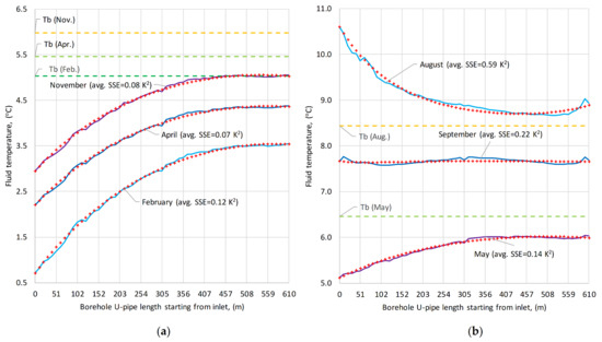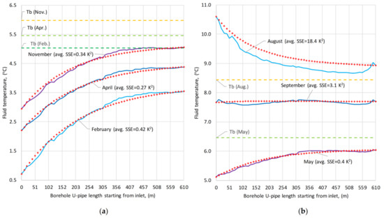 Winter operation is characterized with significant heat extraction from November to April (from −12 to −18 W/m) and higher pumping flow rates (0.4–0.5 l/s), while summer period is short, mostly comprising only 3 months (June, July, and August). September is almost neutral (heat extraction roughly equals injection) reflected in its lower LMTD and fluid-to-water heat transfer coefficient bf–w. On the other hand, typical winter months present higher LMTD close to 1 (0.9–1.1 °C) and higher fluid-to-water heat transfer coefficient bf–w (65–75 W/m2K). Winter months are also easier to fit to DTS measured data, as reflected in their lower SSE values (0.1–0.5 K2). Overall, the second method is the most accurate and capable to fit extremely well to DTS measurements, reflected on its lowest SSE.