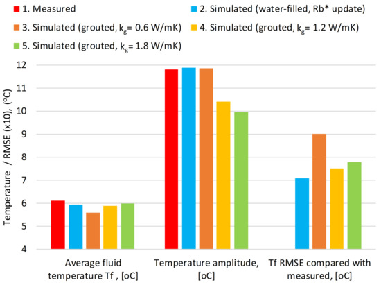 The proposed enhancement of Pygfunction is applied with daily update of the effective thermal resistance Rb* calculated for groundwater-filled boreholes. For each timestep, the algorithm for Rb* is executed twice—for each one of the boundary conditions UBW/UHF—and finally the average of the two outcomes is taken, as suggested by Spitler and Javed [4]. The enhanced Pygfunction simulation is finally used for validation against measured fluid temperatures of the initial 39 months of system operation. It is also compared with alternative Pygfunction simulations where the value of Rb* is constant, calculated with the multipole method [31,32] for grouted boreholes used by default in Pygfunction. Root mean squared error (RMSE) is the metrics used for comparing simulation vs. measured data, defined as follows: