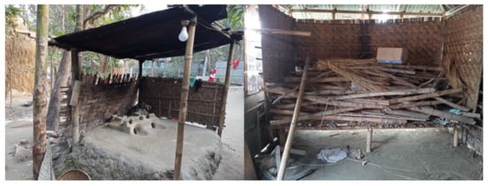 A typical outdoor kitchen (left) and firewood storage shed (right) at Jaldhaka, Nilphamari.