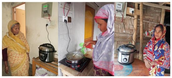 All households were supplied with the rice cooker (RC), hot plate (HP), induction cooker (IndC), and electric pressure cooker (EPC) and were requested to use only one device at a time for at least 15 days, make the most of cooking and measure the amount of food cooked, the time required in the cooking process, and most of all energy meter reading. We arranged several training sessions and online meetings to impart the necessary knowledge and skills required for operating appliances and keeping data. Respondents were briefed about the importance of maintaining the authenticity of the data-keeping process. Moreover, the appointed staff frequently visited the houses and monitored the cooking and data storing process. Data were collected on a weekly basis and analyzed for any irrelevancies. Figure 2 shows all the users whilst cooking foods using provided electric cooking appliances.