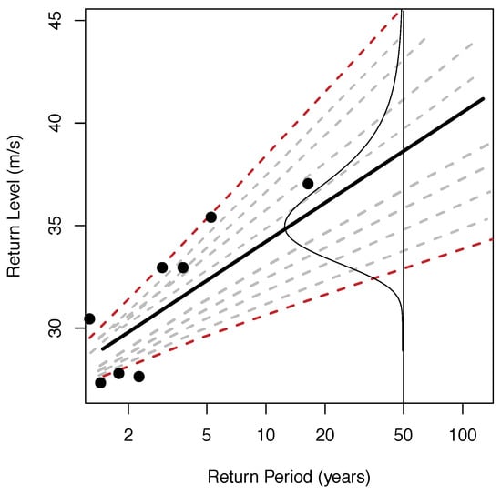 If there are n points (e.g., n yearly maxima) in an experiment, the highest value corresponds to the empirical n-year quantile, the second maxima is the (n-1)-year empirical quantile and so on []. Thus, if the fit is suitable, the observations compare well with the estimations for return periods equal or shorter to the observational period (in our case the observational period ranges between 4 and 15 years). To compare well with observations, the empirical points should be comprised within the corresponding 95th confidence interval. Otherwise, the experiment is rejected. The empirical return levels are calculated by interpolating the observed extremes in the corresponding estimated return level (solid black) line.