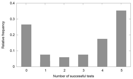 Histogram of successful goodness-of-fit tests. The relative frequency of the amount of experiments that surpass a certain number of tests (up to five) is calculated with respect to the total number of experiments initially implemented.