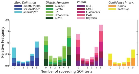 The competence of the statistical methods applied herein to fit the observed data was verified in this study by means of a set of different tests and model diagnostics (MD). These involve metrics for how the observed extremes occurrence fits the theoretical probability distributions. As the first model diagnostic (MD1), five different GOF tests are applied to each one of the configurations explored (Table 1) The number of tests that each experiment should succeed to positively accomplish in MD1 is determined on the basis of the relative frequency of the amount of GOF tests that are surpassed by the pool of experiments carried out. A histogram of the frequency of GOF tests successes is represented in Section 4.1 to help define the threshold that indicates which configurations should not be considered reliable.