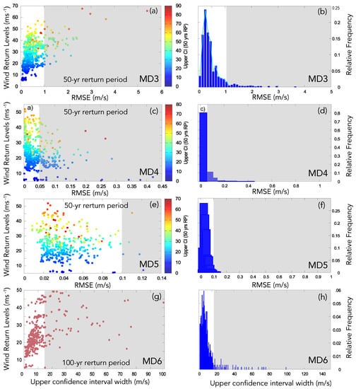 Thus, an indirect measure of the suitability of a distribution to model the observed extreme values is whether its associated confidence interval is outstandingly wide, relative to the sample population. A tendency to wider upper than lower confidence intervals was observed in most of the fittings (not shown). Thus, only the upper bound width of the confidence interval was represented in the right y-axis of the corresponding RL-RMSE dispersion diagram to identify fit inadequacy. These steps (RL-RMSE diagram and the histograms of relative frequencies of the RMSE values to decide a RMSE rejection limit) are repeated after each model diagnostic.