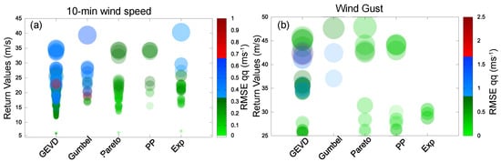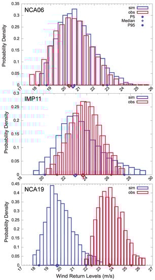 Once the observed wind series were adjusted using a particular configuration (see Table 1), the return levels are estimated as the quantiles of the distribution. There is no standard procedure to assess the quality of the estimated return levels in the literature The filters or assessments applied herein to determine the trustworthiness of each configuration are based on evaluating the ability of the distribution to represent the observed data [].