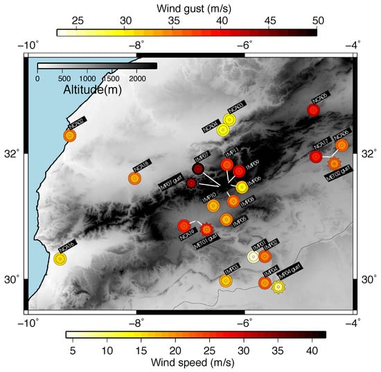 The location of the observational sites is represented in Figure 1, where the length of the time series at each site can also be observed. Most of the time series have at least 10 years of records although there are locations where the wind gust measurements are no longer than a few years. The different institutions that provide the data are indicated with symbols in the map. The observational wind data were compiled from three different sources: a set of 10 sites with 10-min wind speed averages was provided by the National Center for Atmospheric Research (NCAR, https://www.mmm.ucar.edu/wrf-tutorial-overview, accessed on 19 September 2021), these sites are denoted as NCAxx; two more observational sites by Météo Maroc (METxx) that included both 10-min wind speed and wind gust and finally, data from the IMPETUS project [], with 11 meteorological stations reporting 10-min wind speed averages and/or wind gust measurements at 10- or 15-min resolution.