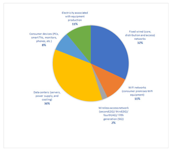 However, while data centers receive the bulk of attention, they do not necessarily account for the majority of ICT energy consumption [36]. Various types of networking equipment (from the core backbone, to on-premise consumer-facing access points, to the xG wireless access networks) constitute approximately 45% of total energy consumption, while consumer data centers account for 36%, equipment, electricity associated with equipment production makes up another 8%, and device usage 2% (Figure 1).