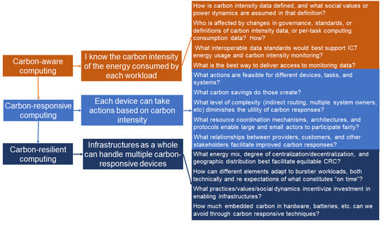 Because the stages are interdependent, a designer, developer, or engineer can use the guiding, high-level questions outlined in Figure 2 to reflect on possible consequences in other areas of a CRC-enabling infrastructure. For example, if a networking engineer wanted to create software for routing packets in the least carbon-intensive way, she is working in the “carbon responsive” stage. However, if she examines the questions in the carbon awareness phase, she might not just look for the most convenient data, but realize that carbon intensity data that she is planning to use might have been defined in a way that does not match her values concerning different energy sources. She might advocate for changing how those data are collected, or choose another source so as not to give further legitimacy to those data. Conversely, the questions in the carbon-resilient stage might encourage her to probe on whether societal expectations of “on time” can change if there is a significant carbon gain, or if those expectations are indeed immutable and the better strategy is to encourage more on-site renewables at key nodes of the network.