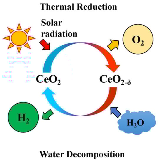 2-δ thermochemical two-step water-splitting cycle reaction that utilize solar energy to produce oxygen and hydrogen. The two-step water-splitting cycle can be explained using the two equations below, where Equation (1) is for the thermal reduction step for oxygen evolved from CeO