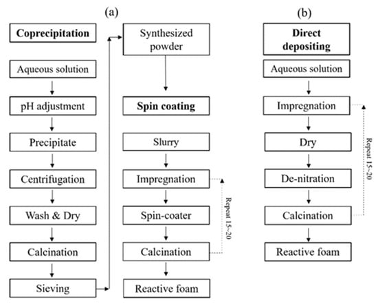 The reactive foam device samples for the two-step water-splitting cycle for oxygen/hydrogen productivity estimation were fabricated using two different methods. The first was the synthesis of Mn-CeO2 powder via a coprecipitation method, and then coating onto a disk-type porous foam (MgO partially stabilized zirconia, MPSZ) using a spin coating process. The other method was a direct depositing method, which contemporaneous synthesizes and coats the Mn-CeO2 foam device.