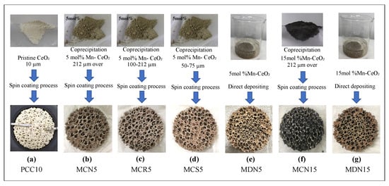 Photograph of CeO2/Mn-CeO2 powder samples and reactive CeO2/Mn-CeO2 coated foam devices. (a) Pristine CeO2 spin-coated foam device (PCC10); (b) co-precipitation with 5 mol% Mn-CeO2 spin-coated foam device with over 212-µm powder size (MCN5); (c) co-precipitation with 5 mol% Mn-CeO2 spin-coated foam device with powder size of 100–212 µm (MCR5); (d) co-precipitation with 5 mol% Mn-CeO2 spin-coated foam device with powder size of 50–75 µm (MCS5); (e) direct deposition of 5 mol% Mn-CeO2 foam device (MDN5); (f) co-precipitation with 55 mol% Mn-CeO2 spin-coated foam device with over 212-µm powder size (MCN15); and (g) direct deposition of 15 mol% Mn-CeO2 foam device (MDN15).