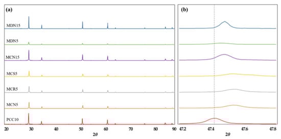 XRD pattern of all prepared foam devices: (a) XRD pattern for the range of (2θ = 20–90°) and (b) expanded range of (2θ = 47.2–47.8°) which showing the peak shift toward higher diffraction angle by the incorporation of Mn into CeO2.