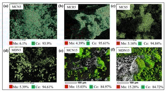 On the other hand, the direct depositing method has the advantage of a rapid fabrication time and is lossless for Mn-CeO2. The doping and coating processes are conducted simultaneously, which can save time in terms of fabrication, and does not lose reactive materials. In addition, by the third stage of the dry and calcination temperature program, the residual nitrate (NO3−) in the solution can be effectively removed, and a homogenous coat surface can be achieved. The detailed steps for each synthesis and coating process are explained in the following sections.