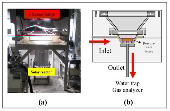 (a) Photograph of a 3 kWth sun-simulator. (b) Schematic diagram of solar reactor with a reactive foam device for the two-step water-splitting cycle.