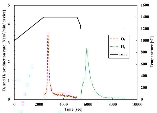O2 and H2 evolution profiles of two-step water-splitting cycle of pristine CeO2 foam device (PCC10) in the first cycle.