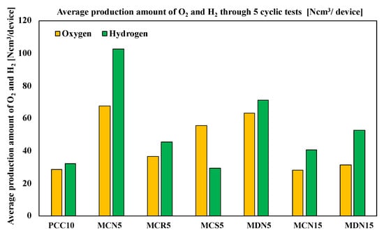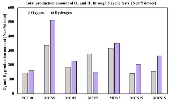 Total production amount of O2 and H2 through 5 cyclic tests (Ncm3/device).